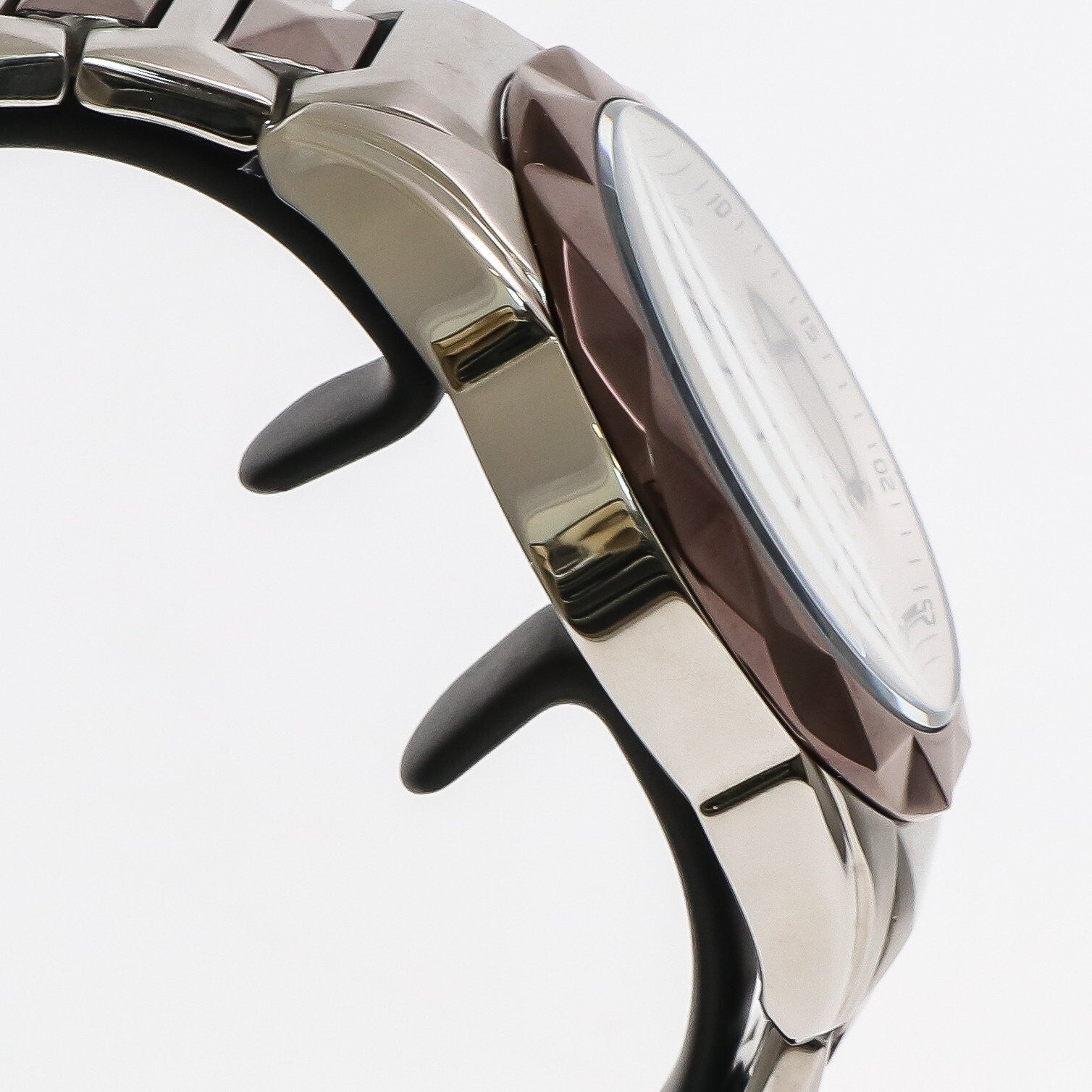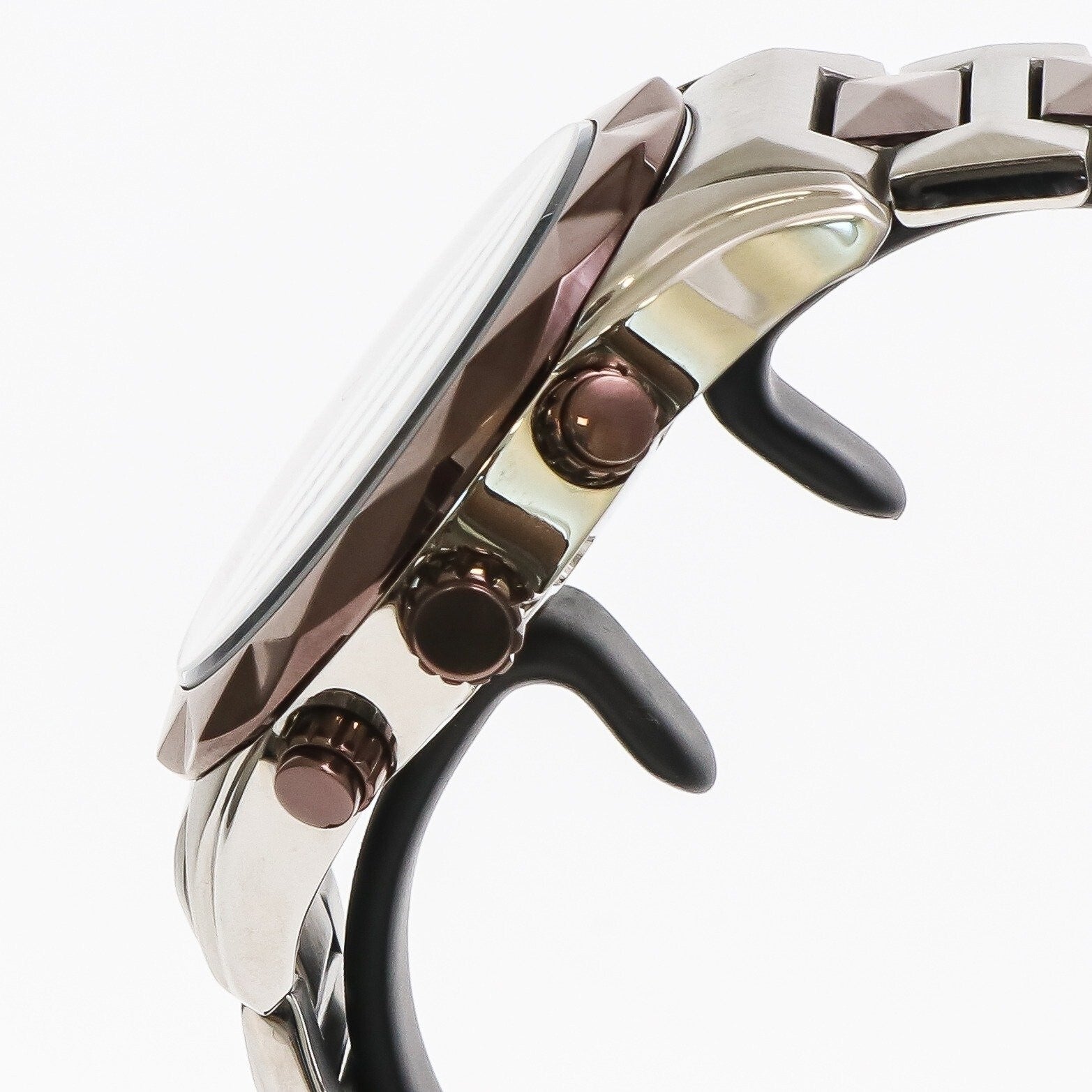 The Optima 44mm Swiss chronograph watch with date feature is a luxurious and stylish timepiece suitable for casual or sporty occasions. The watch is designed with a white mother-of-pearl dial, Arabic numerals, and dagger indexes, housed in a stainless steel case with a polished finish. The watch has a bi-color silver and chocolate stainless steel band with a butterfly clasp for a secure fit, and is water-resistant up to 5 ATM. With Swiss quartz movement and luminous hands, the Optima watch is a reliable and elegant accessory for any modern man.