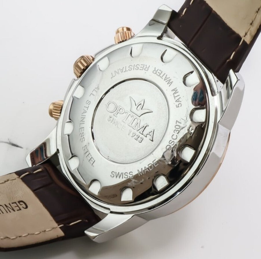 The Optima Swiss Chronograph Watch OSC307-SRL-4 is a stylish and luxurious timepiece designed for men. Featuring a PVD rose gold bezel with a smooth, fixed design, this watch boasts a sleek silver and rose gold case with a polished finish and a 42mm size. The watch comes with a two-piece brown leather strap, a butterfly clasp closure, and a 50m water resistance. With a Swiss quartz movement, central second, date indicator, and luminous hands and indexes, this watch is perfect for both sporty and casual wear. Additionally, it comes with a 1-year manufacturer warranty, original box and packaging, and papers.