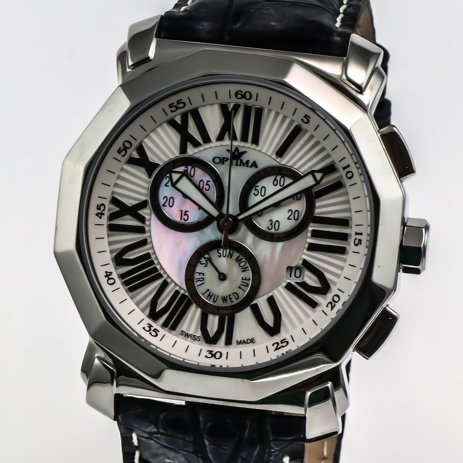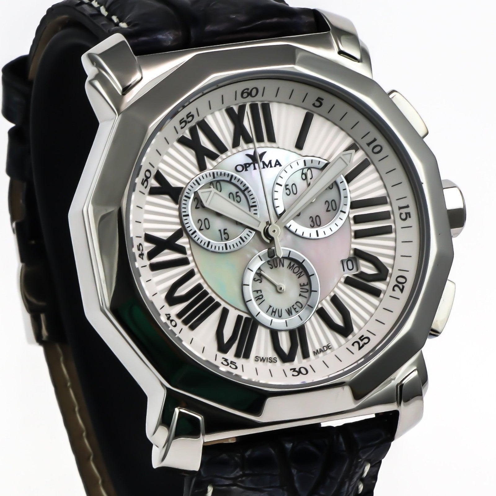 The Optima Swiss Chronograph Watch is a sleek and stylish timepiece featuring a silver colored stainless steel case with an octagonal fixed bezel. This luxury watch boasts a Swiss quartz movement and water resistance up to 30 meters, making it perfect for everyday wear. The watch comes with a 1-year manufacturer warranty, original box and papers, and a black leather two-piece strap with a 24mm lug width and butterfly clasp closure. With its classic design and multiple hands including a chronograph and date indicator, the Optima watch is a must-have for any man's collection.