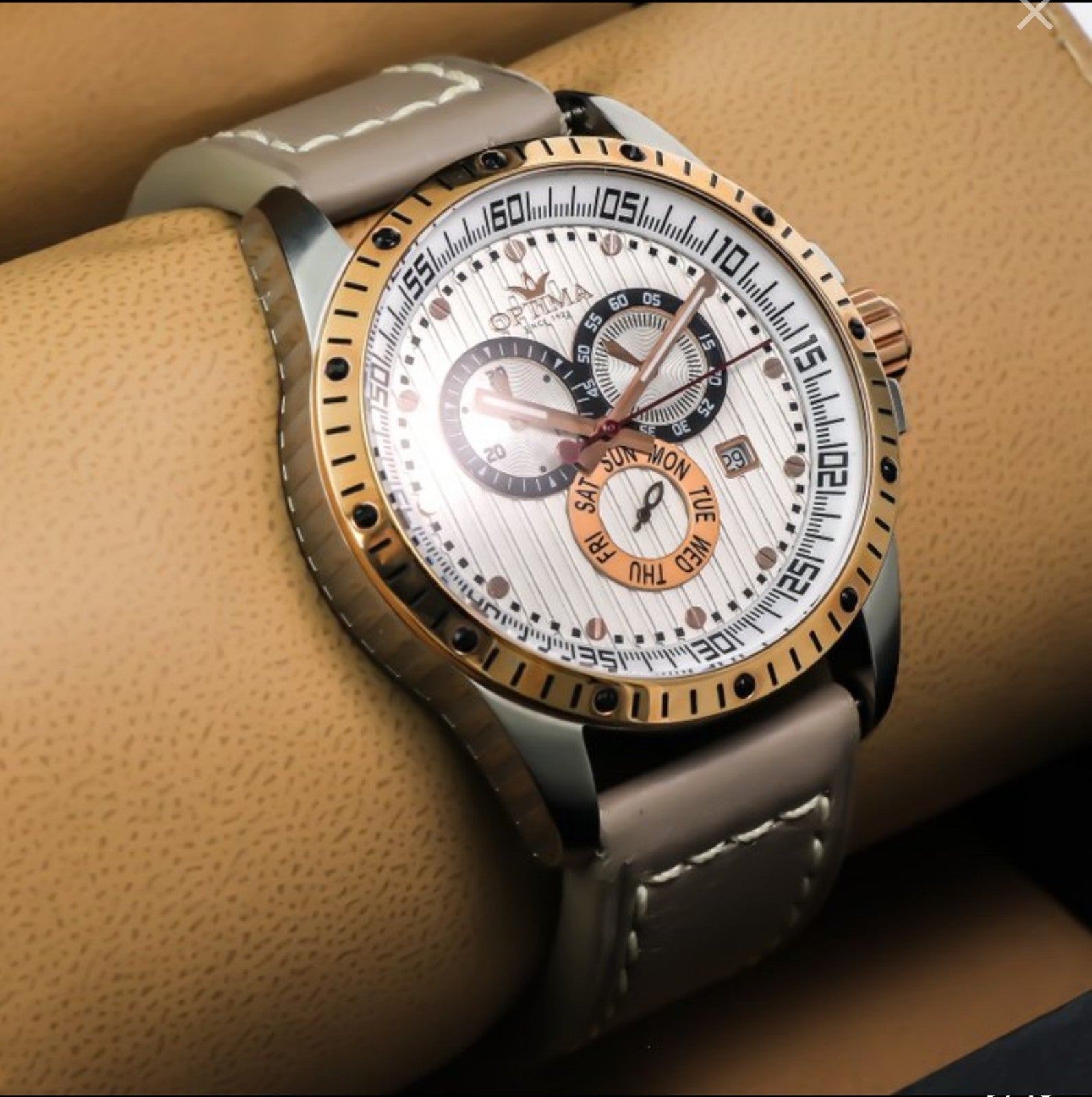 The Optima Swiss Chronograph Watch is a stylish and sophisticated timepiece suitable for men. With a stainless steel case and a 45mm size, this quartz watch features a tachymeter bezel and a two-piece leather strap with a buckle closure. The watch is water-resistant up to 50 meters and comes with a 1-year manufacturer warranty, making it a reliable and durable choice for everyday wear. Swiss movement and chronograph features add functionality to this luxury watch, while the luminous hands and mineral crystal provide added convenience and protection. Overall, this watch is perfect for those looking for a sporty yet elegant timepiece.