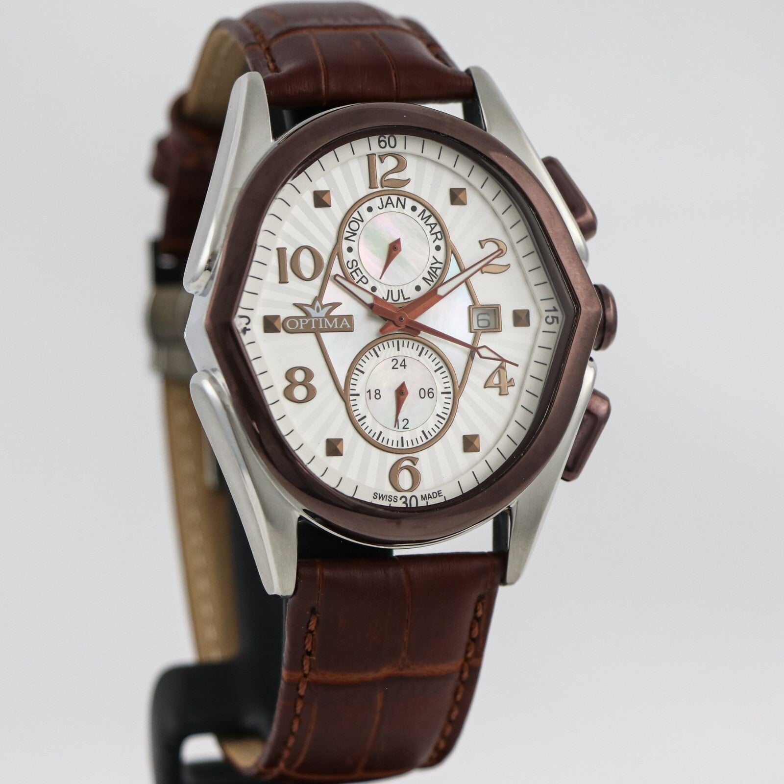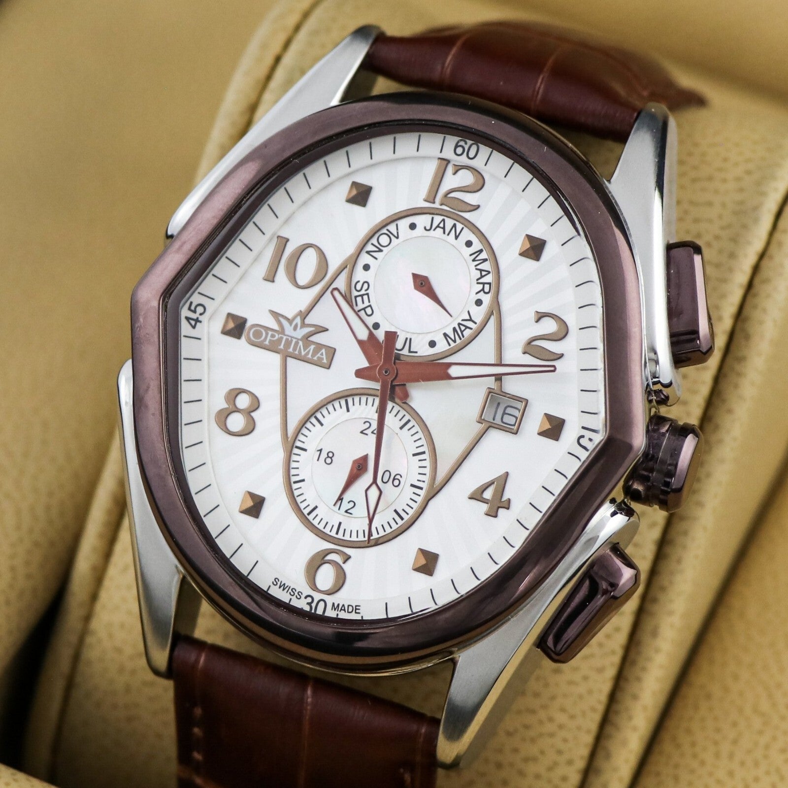 The Optima Swiss Watch is a luxurious timepiece featuring a stainless steel case with a PVD chocolate bezel, complemented by a brown leather strap with a butterfly clasp. This elegant wristwatch has a dual time function, water resistance up to 50 meters, and a quartz movement for accurate timekeeping. With square indexes and Arabic numerals on the white dial, this sporty yet casual watch is perfect for women who appreciate both style and functionality. The watch comes with a 1-year manufacturer warranty, original box/packaging, and is a timeless piece that exudes sophistication and quality craftsmanship.